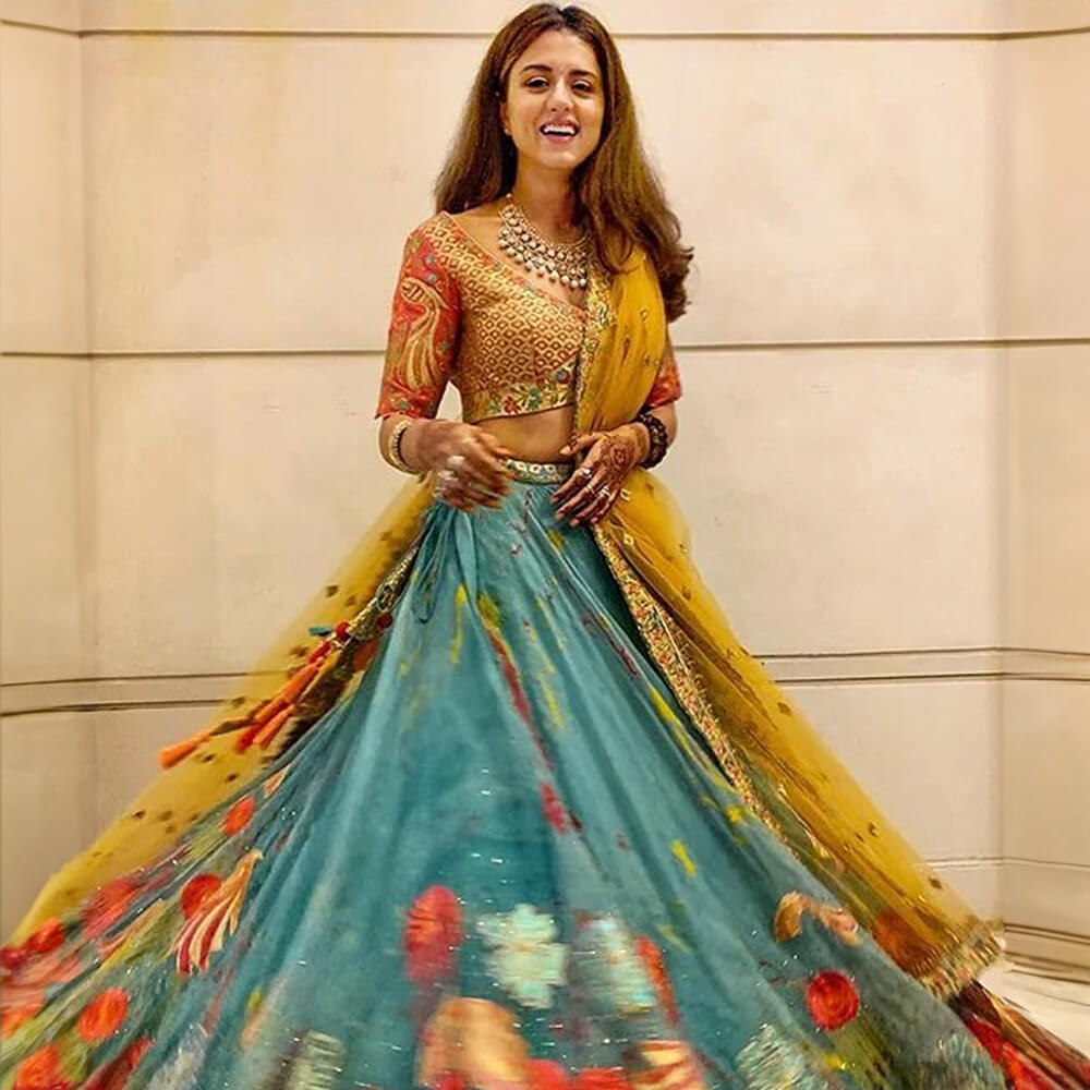 Prominent TV actress and personality Ridhi Dogra looks exuberant in our marble print lehenga from RAAS with floral embroidery