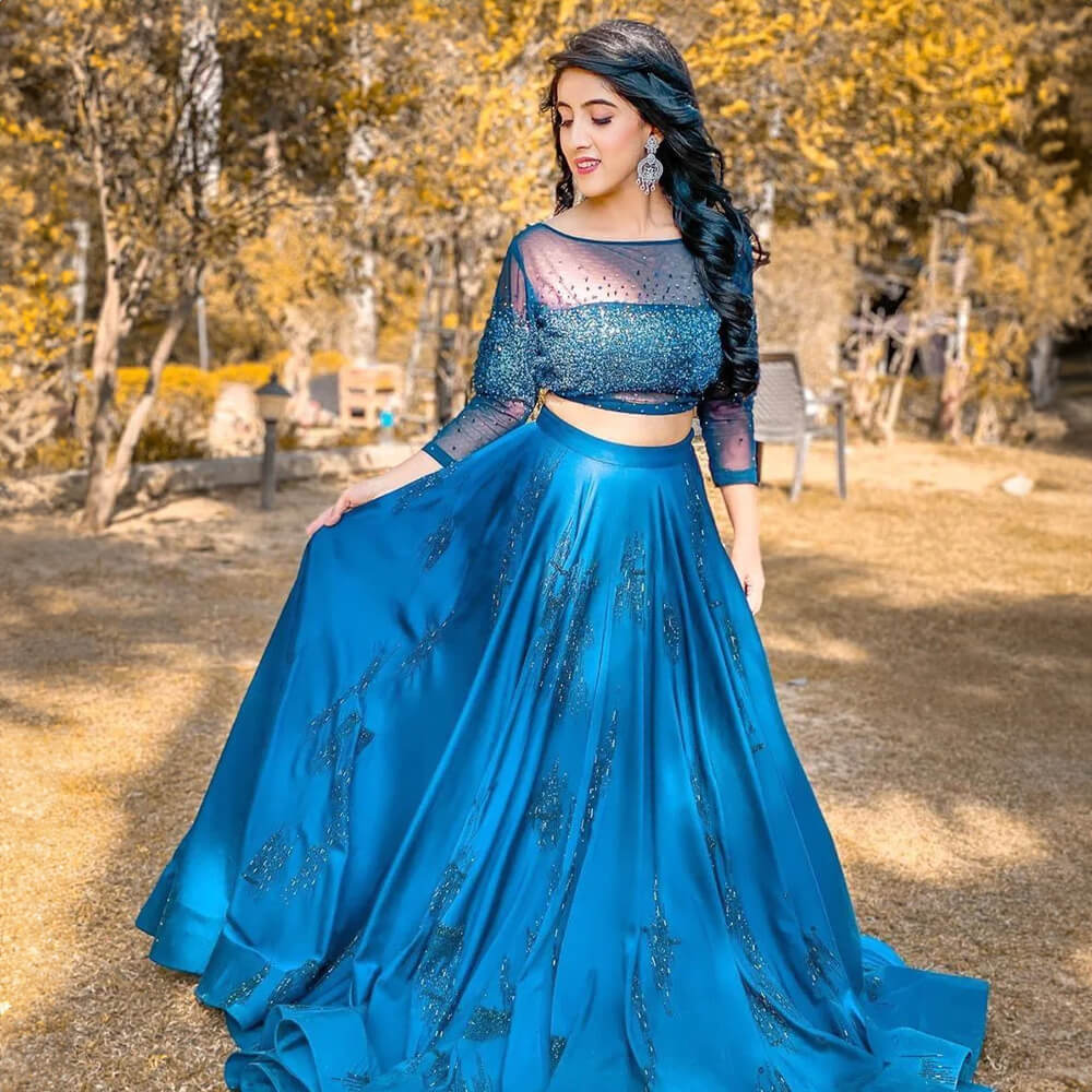Sameeksha Sood styles our Galaxy lehenga in satin silk with a net embroidered blouse and