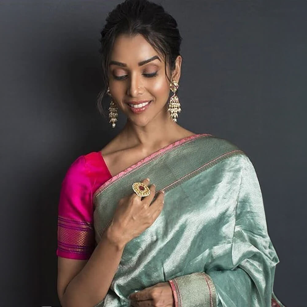 Anupriya looks ethereal in a handwoven grey banarasi silk saree from Kaashi Ghat.