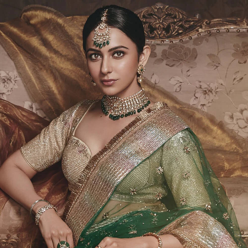 Bollywood actress Rakul preet Kaur looks exquisite in our handcrafted emerald lehenga from our